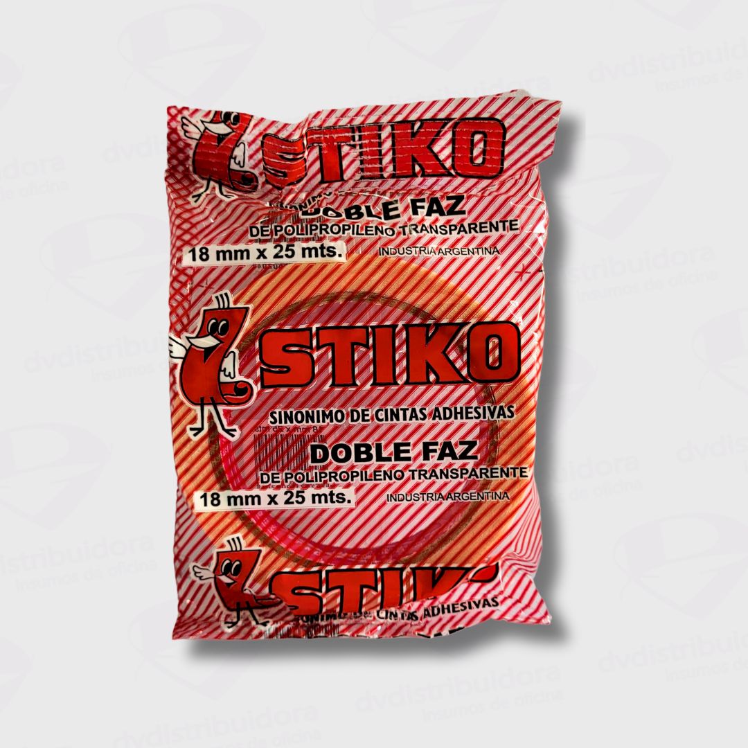 Cinta adhesiva doble faz Stiko 18mmx25mts de polipropileno se vende por unidad. Con medidas de 18mm x 25 metros. Disponible en color transparente. Embalaje individual para su protección.