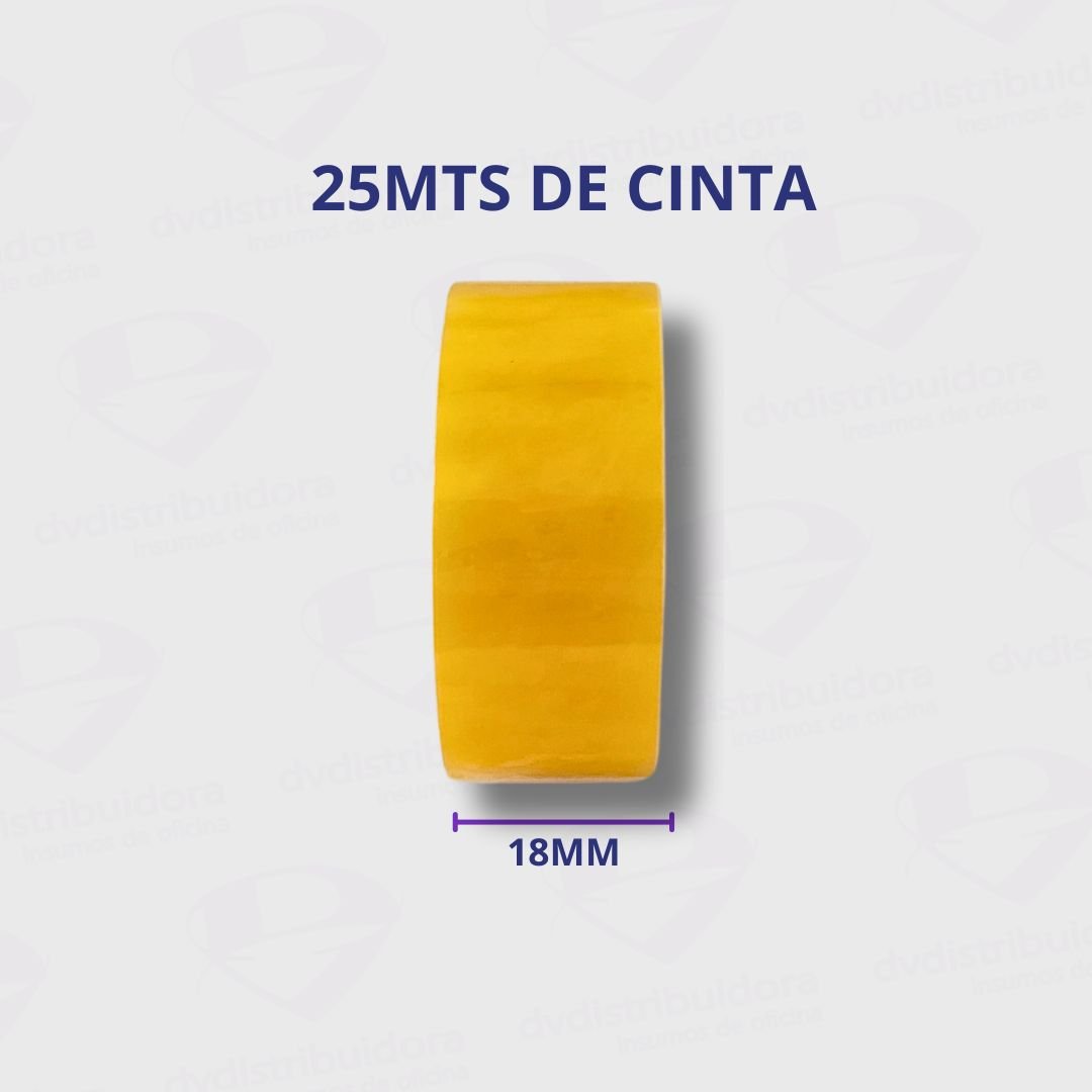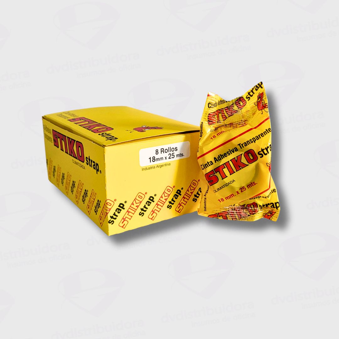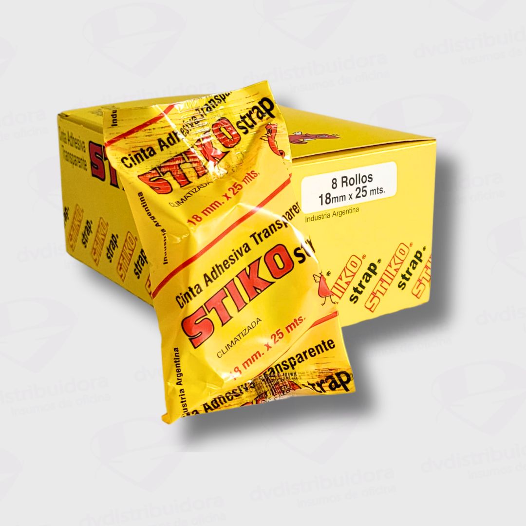 Cinta Adhesiva para escritorio de la marca Stiko, con sus medidas de 18mm de ancho y 25mts de largo. En color Transparente. Es una cinta adhesiva de uso general para cualquier tipo de porta cinta de escritorio.