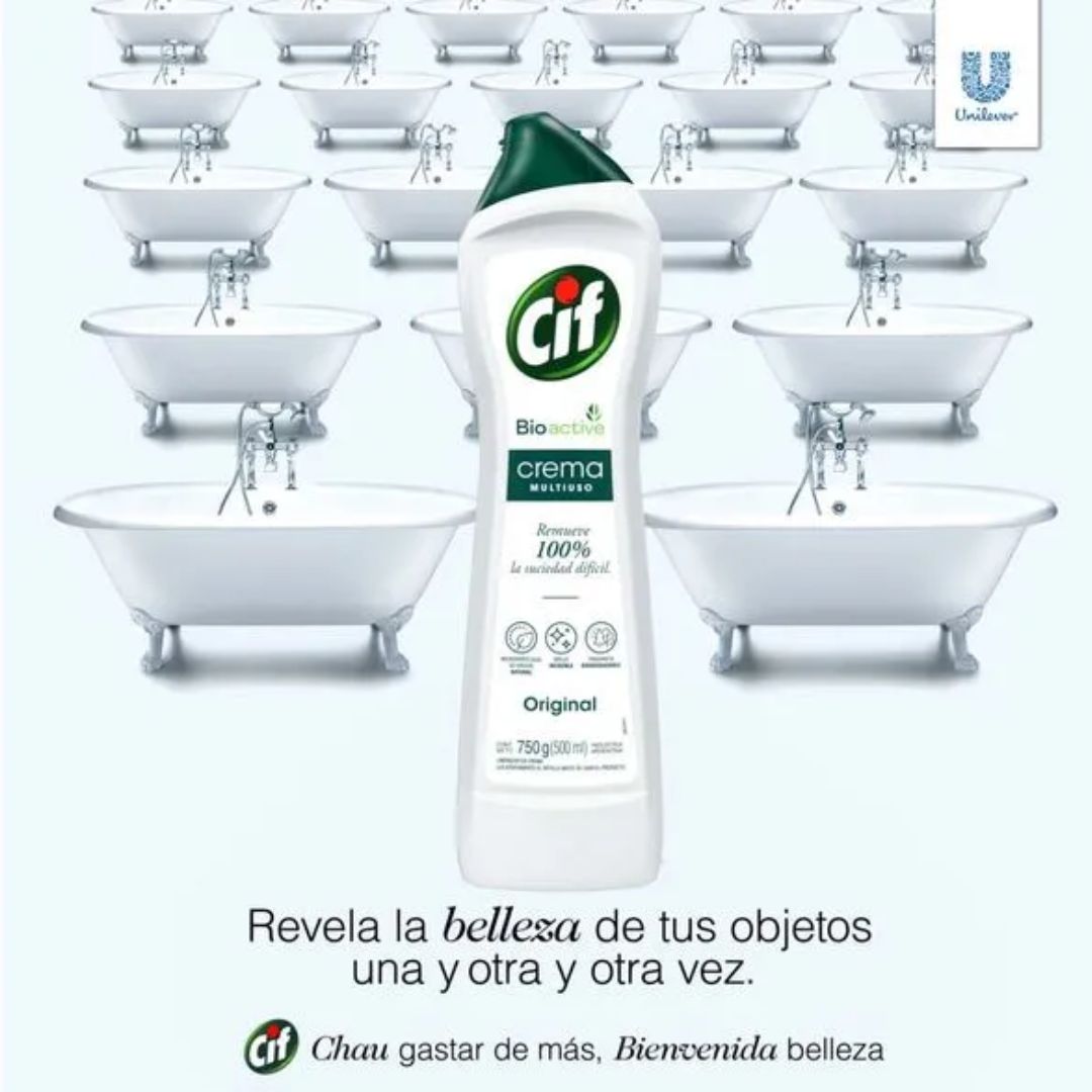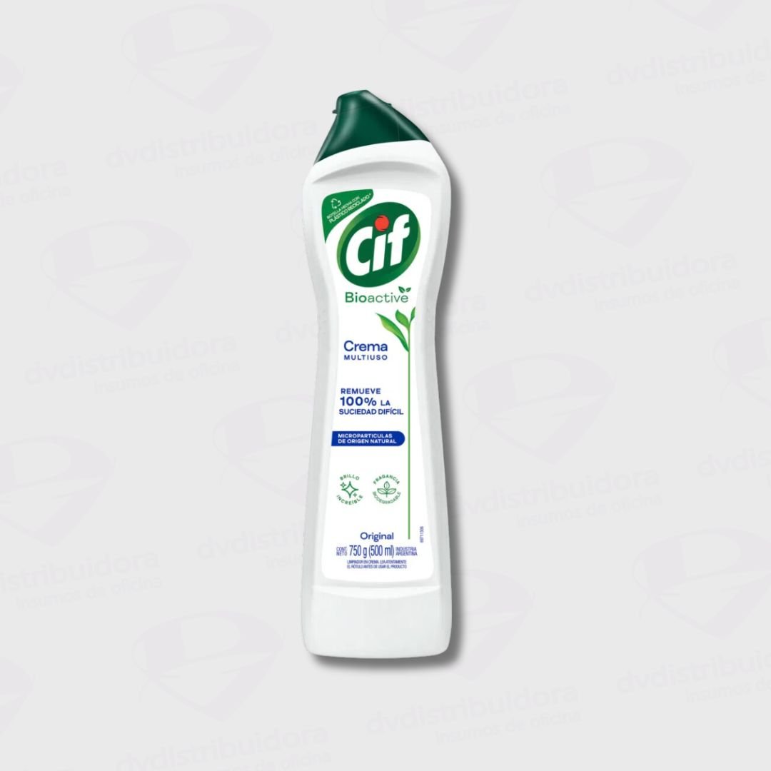El Limpiador Multiuso CIF Crema se vende en botellas de 750 gramos (500 ml) con aroma original, floral o de limon. Disponible en un envase reciclado, contribuyendo a la reducción de residuos plásticos.