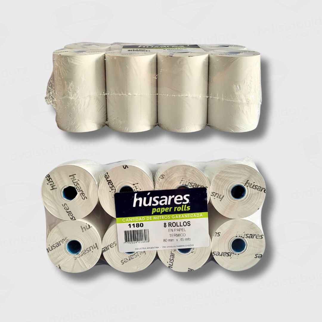 El Rollo Térmico Husares se vende en un paquete que contiene 8 unidades, cada una con un ancho de 80MM y una longitud de 45MTS. Disponible en un único color estándar para adaptarse a tus máquinas de calcular.