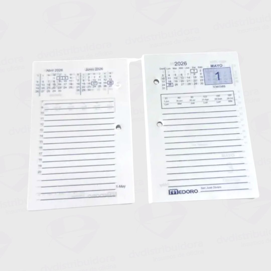 Cada hoja incluye fecha del día, calendario mensual y renglones amplios para registrar vencimientos, cobros, reuniones o recordatorios. Fabricado con papel de alta calidad Medoro, permite escritura clara y sin traspaso, incluso con bolígrafos de tinta líquida.