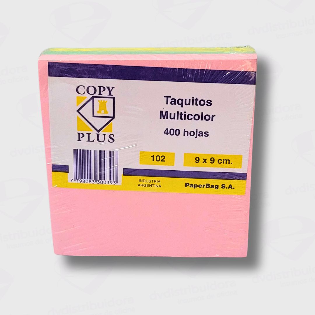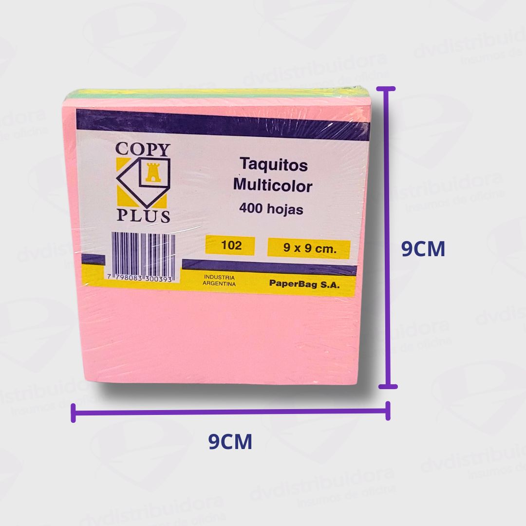 Detalles del Producto: Disponible en colores surtidos para una organización visual efectiva. Se presenta por unidad y tiene un tamaño de 9x9cm con 400 hojas en cada taco.