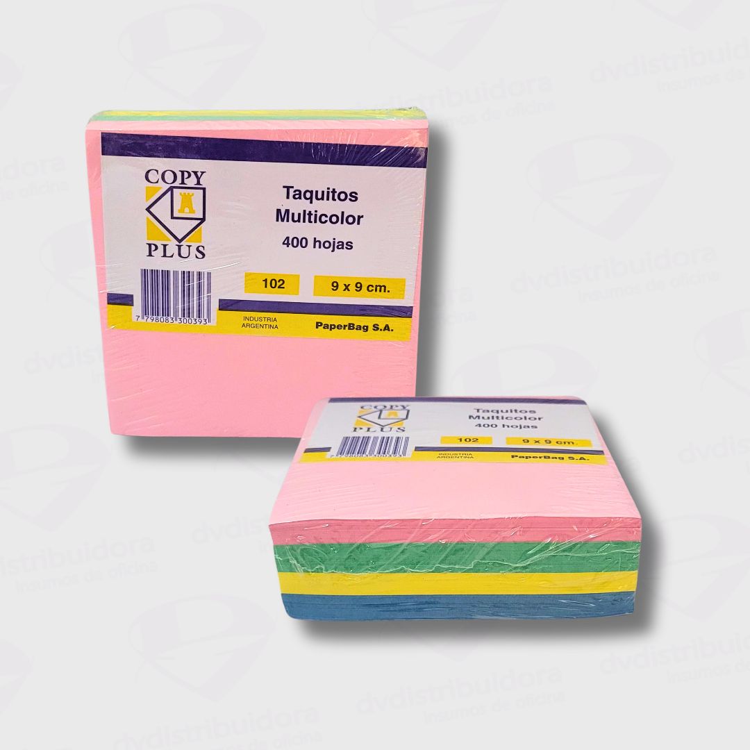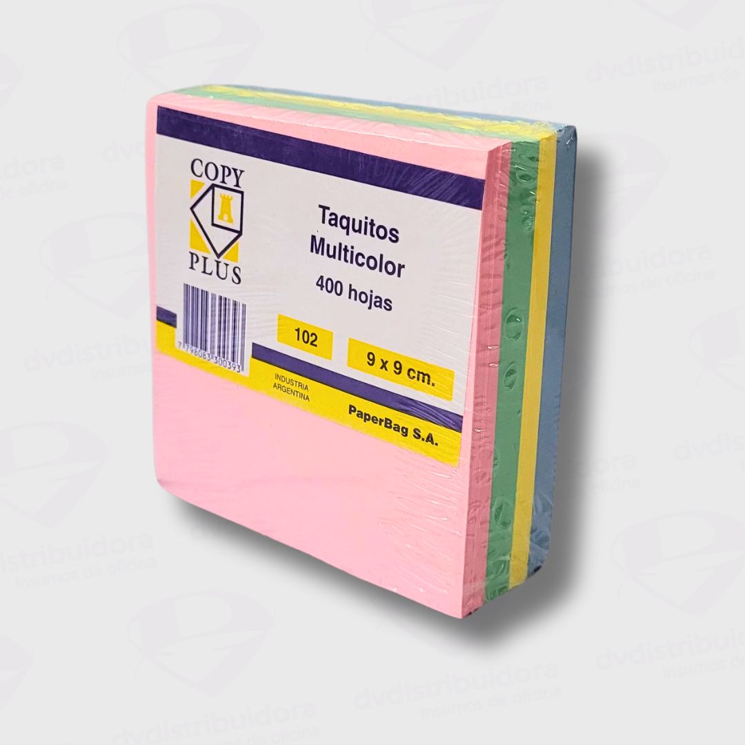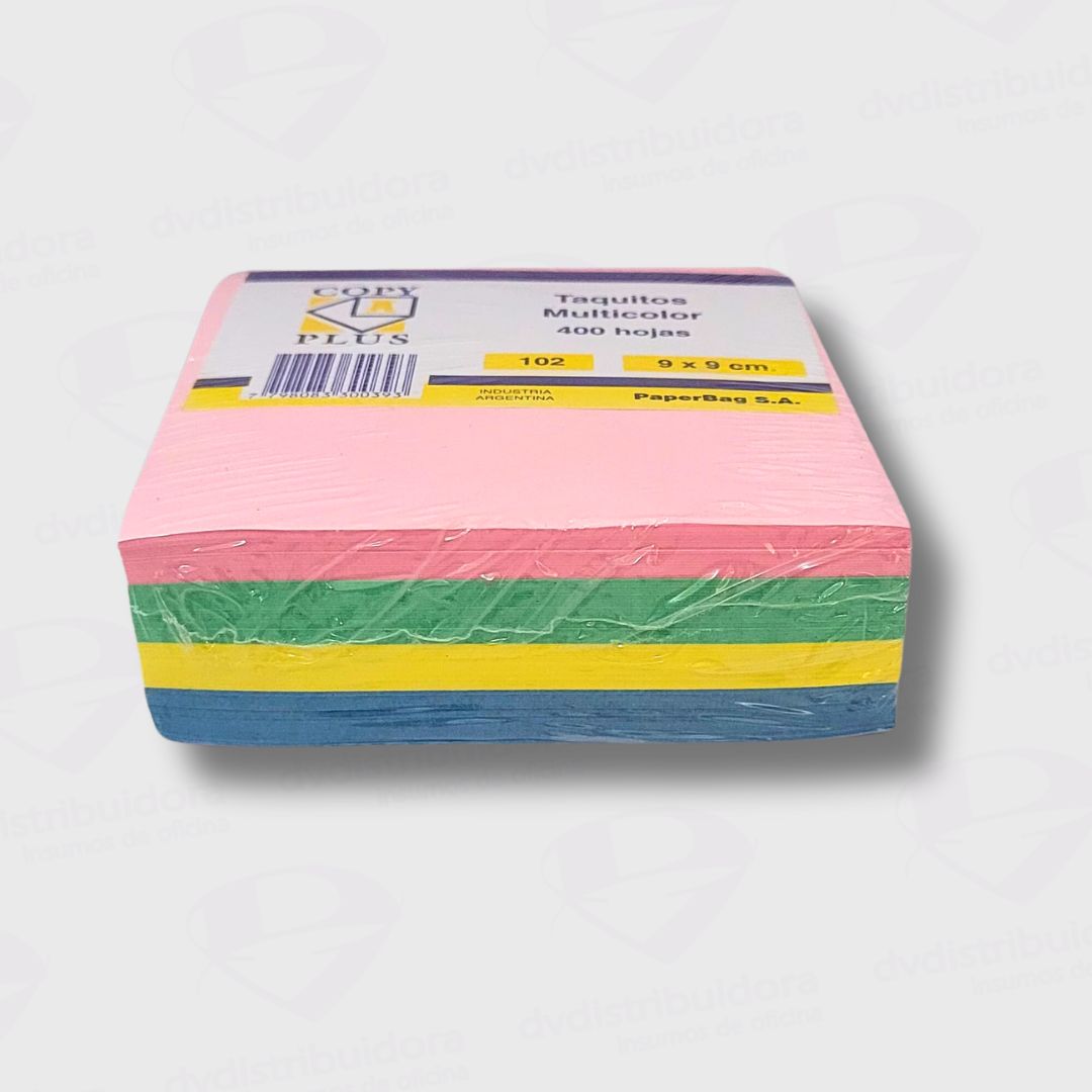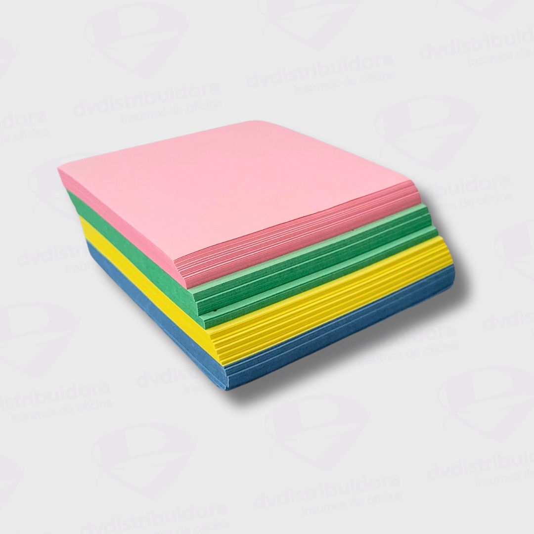 Notas de papel en colores surtidos sin adhesivo, indispensables para no olvidar tareas o información importante. Tamaño 9x9Cm. Taco de 400 hojas.