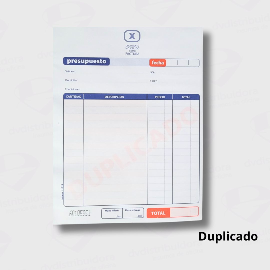 Este Talonario Presupuesto Duplicado Chico Húsares 1817 cuenta con una garantía de calidad que asegura su funcionamiento óptimo. En caso de cualquier inconveniente, contáctanos para recibir asistencia y soluciones rápidas.
