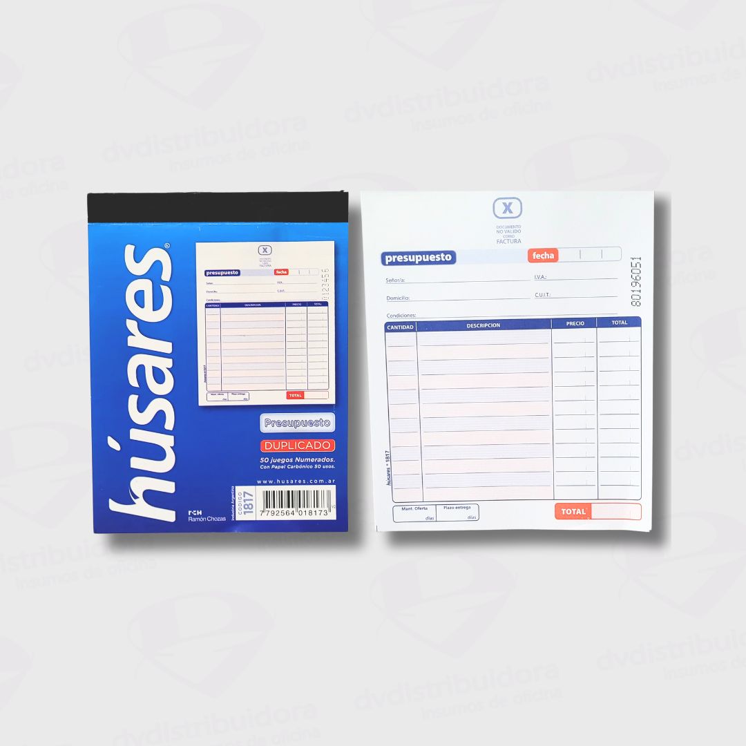 Disponible en colores clásicos como blanco y azul, el Talonario Presupuesto Duplicado Chico Húsares 1817 viene embalado de forma segura para garantizar su integridad durante el envío. Su diseño innovador de formato duplicado con carbónico lo distingue de otras opciones en el mercado, ofreciendo la posibilidad de mantener copias exactas de tus presupuestos de manera sencilla.